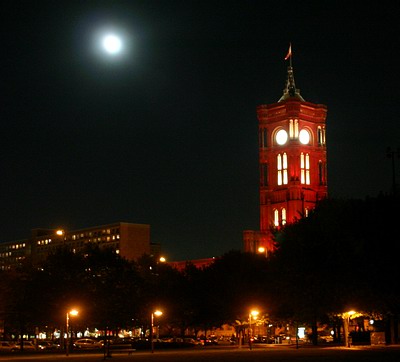 | Dieses Bild mit Fernsehturm und Rotem Rathaus ist keine Fotomontage. Es gibt nur einen (frei zugänglichen) Platz, wo man Telecafe und Rathausuhr auf einmal in den Sucher bekommt. Viel Glück beim nächsten Berlinbesuch - aber bitte tritt mir nicht auf die Zehen. Von hier hinten ist auch etwas von der üblichen 'gelben' Standardbeleuchtung des Rathauses zu erkennen. |