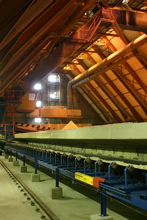 Vor dem Verladen des Gipses wird dieser nochmals getrocknet und dann von LKW abgefahren.