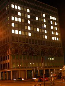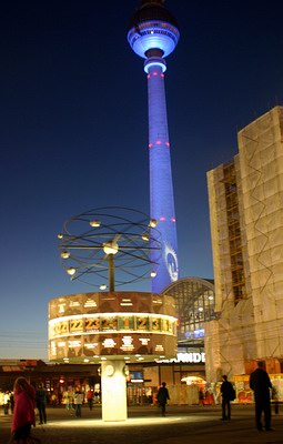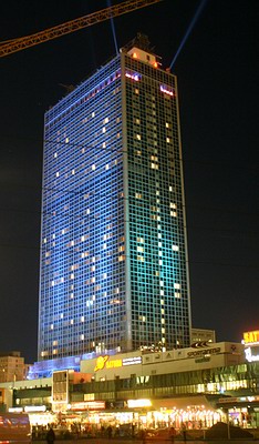 | Die Weltzeituhr am Alex ist nach wie vor der beliebteste Treffpunkt in Berlin. Am Alexanderplatz steht auch das Hotel "Stadt Berlin" (heute "Park Inn"), welches in blauem und türkisgrünem Licht wie ein überdimensionaler Smaragd wirkte. Vier bewegliche Scheinwerfer auf der Spitze des Hotels kreisten unentwegt am schwarzen Nachthimmel. |