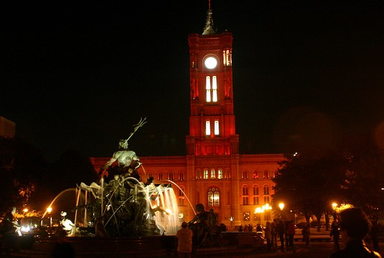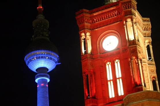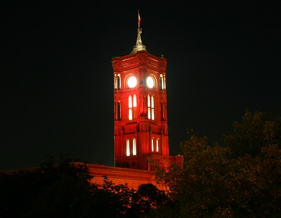 | Dieses Bild mit Fernsehturm und Rotem Rathaus ist keine Fotomontage. Es gibt nur einen (frei zugänglichen) Platz, wo man Telecafe und Rathausuhr auf einmal in den Sucher bekommt. Viel Glück beim nächsten Berlinbesuch - aber bitte tritt mir nicht auf die Zehen. Von hier hinten ist auch etwas von der üblichen 'gelben' Standardbeleuchtung des Rathauses zu erkennen. |