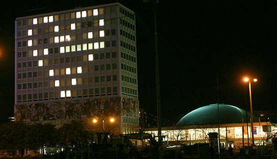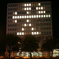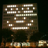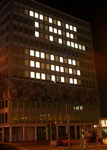 | Wer mehr Action suchte, schaute gebannt auf die ständig wechselnden Motive am Haus des Lehrers. Von Smilies, über eine Digitaluhr bis hin zum Pong-Spiel bildete die Fensterfront eine riesige Anzeigetafel. |