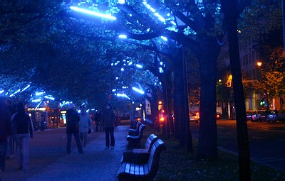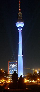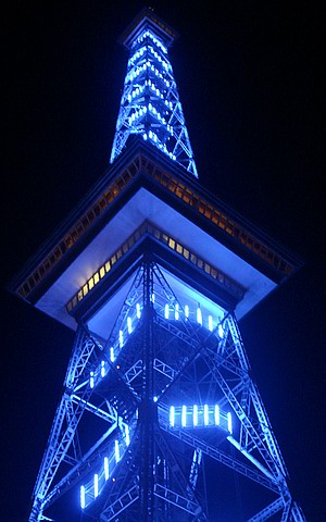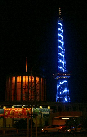 | Aber auch ganze Straßenzüge wie die Straße Unter den Linden und der Funkturm am Messegelände haben eine blaue Lichtinstallation erhalten. Besucher der zeitgleich stattfindenen Sex-Messe "Venus" hielten den blauen Lümmel jedoch eher für ein wegweisendes Phallussymbol. |