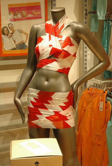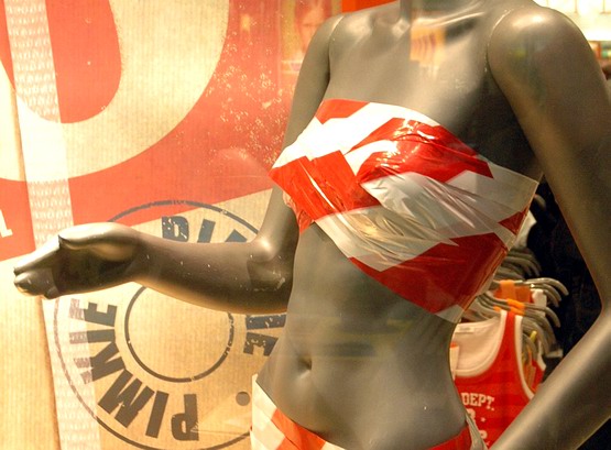 | Sowohl der übliche Kaufrausch bei gesenkten Preischildern als auch die ungewöhnlich lang anhaltende Kälte hat in diesem Jahr zu großer Nachfrage an warmer Wäsche geführt. Selbst die Schaufensterpuppen mussten daher ihr "letztes Hemd" hergeben. |