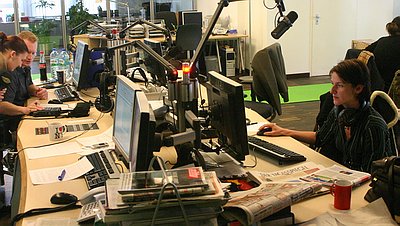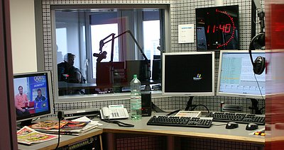 | Gearbeitet wird auf beiden Seiten mit neustem identischen Equitment. An digitalen Reglerpulten wird das Programm zusammengestellt und lässt sich dann sekundengenau im Display verfolgen. In geräumigen, geräuschisolierten und gut klimatisierten Glaskabinen werden Nachrichten gesprochen, Interviews geführt, Dschingels produziert oder ein Song anmoderiert. |
